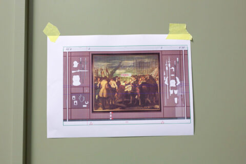 The other copy, an older version by Kees Maks (1903), was previously exhibited in the Grote Kerk (Grand Church) and the Breda’s Museum. When the Stedelijk Museum Breda opened, the painting was placed in the museum café. However, following a recent renovation and a shift in focus within the historical exhibition, it has now returned to the main gallery. Once again, a certain glorification of past grandeur comes into play, reinforced by the renewed attention to Nassau history in the Royal Roots programme. These aspects shape the social engagement with the painting and the perception of authenticity.