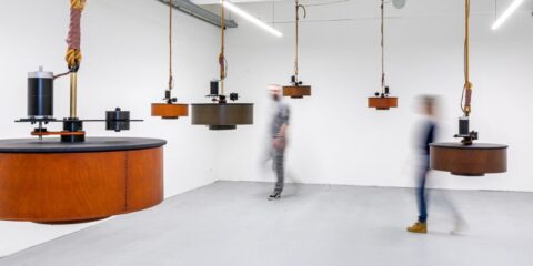 Installation / sound sculpture BROM 2021 (photo: Mark Arends) – motorised instruments suspended from the ceiling create a spatial sound sculpture