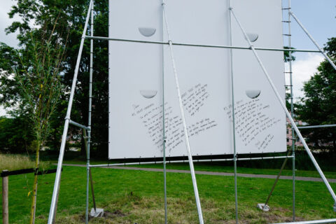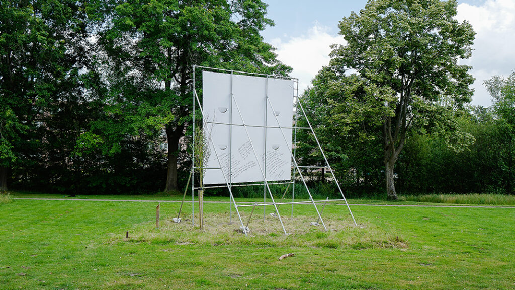 The disruptive power of Ahn’s intervention in the park already became apparent on the first day when he was still busy installing the billboard. Axel Coumans, the artist in residence of the 49m2 before Ahn, did not realize a project on site which left the place unmaintained during spring. Consequently, the grass was tall, and weeds were growing everywhere. Ahn therefore felt like he had to cut the grass a bit so that it wouldn’t interfere too much with his own project. Funnily enough when he started to cut the grass, a woman passing by came up to him, worried about him destroying the artwork. She was angry and wanted to call Witte Rook to report Ahn’s ‘destructive’ behavior. Ahn still has to laugh when he tells me about the incident and explains that he is actually really happy with a response like this. In fact, reactions like these are exactly what he hopes for, he wants to break people’s habits or thought patterns with his work, which clearly happened when the woman got angry about cutting the grass.