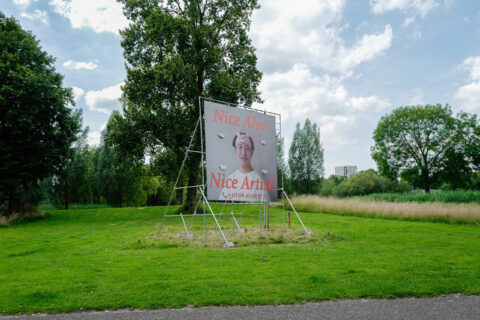 On a 49 square meters patch of grass in the middle of the Zaartpark in Breda, a large banner has appeared. It shows the picture of a man in a white shirt with a pink panther headband. “Nice Ahn!” is written in big orange letters above his head. At the bottom of the banner, in the same orange letters, another short phrase reads “Nice Artist!”, with a phone number right underneath: +31) 06 45 00 97 57.