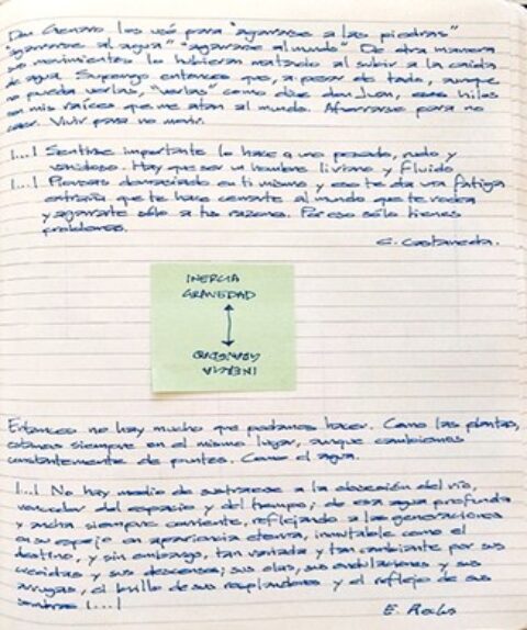 |…| perhaps the path of uncertainty needs a recount. When my head is empty, full of doubts, I turn to what has already been done. Could it be this going backwards, this nostalgia as Emile Ciorán calls it, a denial of the present [11] because we do not know what to do with it. Flee. Then I remember that in reality we just do nothing but dwell on the same things throughout our life; that there is no such thing as novelty. I don’t know what to do with this bunch of complexities. There’s not much to do. We are subject, like plants, to doing the same things, in order to stay in the same place despite being in motion |…|