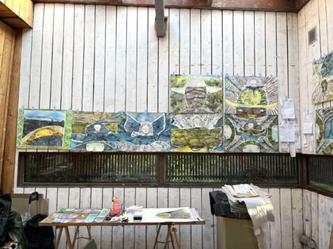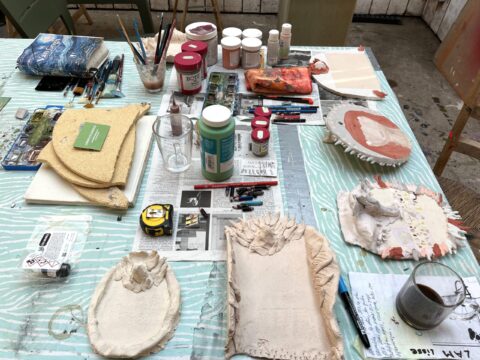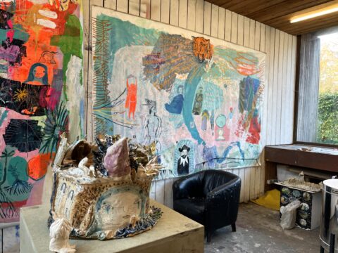 A residency of a month is very short; I decided to work on ceramics, drawings and paintings simultaneously. I planned how to work with clay in these few weeks, but the real problem is the drying time. If I start firing too fast, in my experience, the piece breaks when it comes out of the ceramic kiln. I also brought some of the ceramics with me that I made earlier at EKWC. Here you see a ceramic with a Vincent talking with artist Wilfredo Lam depicted in two illustrations. You see the chair that Vincent painted, and the version Wilfredo made of that painting. In my view, this artwork is an imaginary meeting where they met and discuss the way of depicting this. It’ s fascinating how both artists used a daily life object, a chair, as inspiration on different periods of art history.
