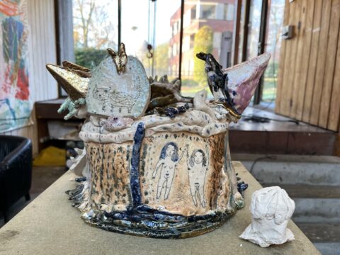The crown is indeed different; mostly I use ceramics as a container. On paper I paint random idea’s but on ceramics I put ideas. For me it is a canvas, but it is a particular canvas. I also like to write on my pieces of ceramics, and I always depict something on the back of it. It is like a secret or an easter egg; it is like a portret, the idea of something behind the work you are looking at. This face could be a mask, but I also need to discover what it is. For me ceramics is a way to relate to different forms of telling the story in another way. Besides my interest in history, I use it in a way to talk of history. And I live on an island with hot and humid weather that can damage paper, but not clay.