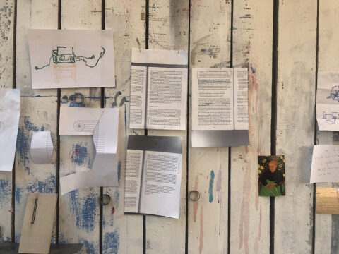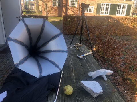 I am going to move the studio to the gallery. My work is outside, so I have the space to do this. I will display the process wall that was created here. I also made a film of the entire process by placing a camera in the studio. I will show that too. The studio has a life that is not present in the white cube. I think that in this way the story can be told, as well as what happens outside. The film also includes a beautiful shot of the gardeners hanging the horn in the pear tree. I also love telling stories and am looking for a form that doesn’t require my presence. The power of storytelling is within me, but that experience must also exist without me. That is now happening through the horns. It’s nice, now that I’m still here, to hear people’s reactions and what they think of it.