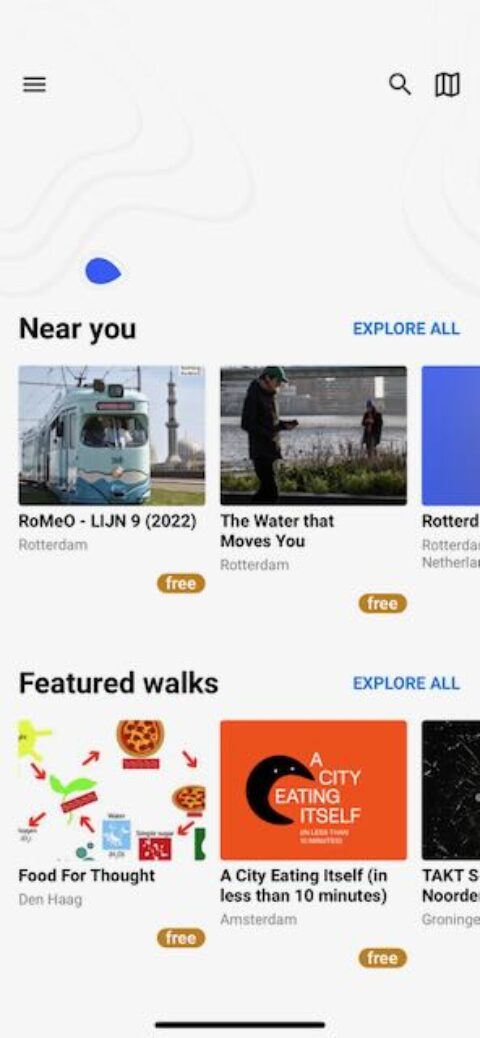 - Bij het openen van de app zie je een witte achtergrond met een plaatje van een blauwe kaart. Daaronder staat EXPLORE en nog wat tekst.