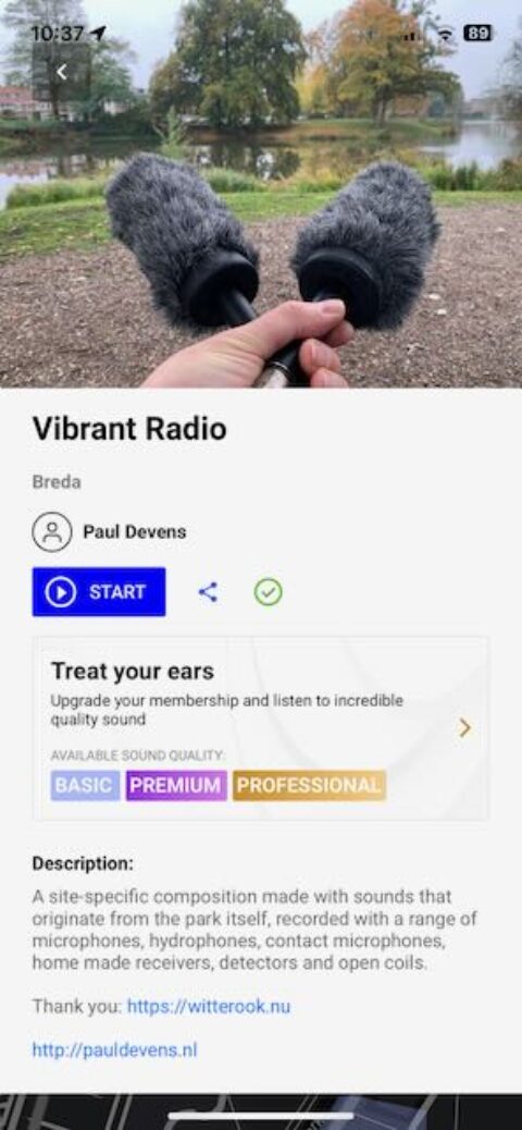 Wat leuk dat je een of meerdere geluidswandeling(en) wilt gaan doen. Verschillende kunstenaars hebben in opdracht van Witte Rook speciaal voor het Wilhelminapark een geluidswerk ontwikkeld waarbij het park zich telkens op een nieuwe manier kan ontvouwen. Luister, kijk en verwonder je steeds opnieuw. — Volg deze instructies om de juiste ervaring te krijgen.