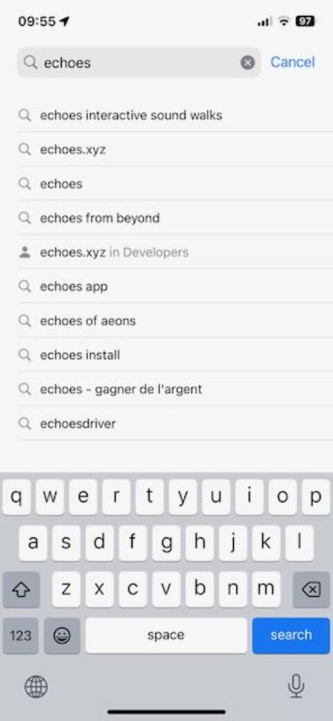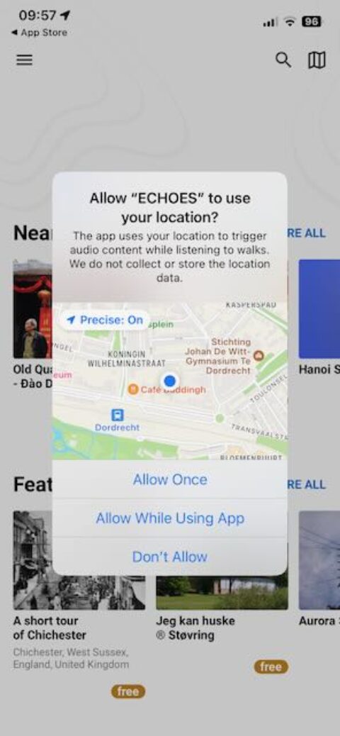 - Dan komt er een pop-up scherm met de vraag of ECHOES jouw locatie mag volgen, klik op Sta toe terwijl je de app gebuikt.
