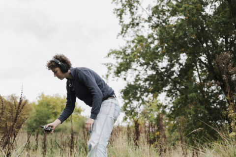Anoek wil geluiden vangen, maar niet die rondzweven in de lucht of die we al kennen. Een normale microfoon neemt vooral deze geluiden op, dus hanteert ze ander materiaal. Priemen en plakkers die werken als een microfoon en verbonden zijn aan een recorder met koptelefoon. Zo neemt ze geluidsgolven op die zich in de grond plaatsvinden. Als ik de koptelefoon opzet, valt me vooral een monotoon, brommend geluid op met af en toe een uitschieter. Een harde klank, ruis of diepere brom doorbreekt het eentonig geluid. Later vertelt ze dat deze uitschieters het materiaal vormt waarmee ze werkt. Door ze te combineren creëert ze lagen die langzaam tot composities uitgroeien.