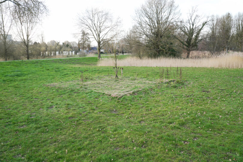 Bekijk hierboven de video van hun zoektocht naar de materialiteit van het landschap: de grond, het water, de bomen en het riet. Door deze natuurlijke materialen te verzamelen en ermee een sculptuur te creëren, laten zij het park spreken in zijn eigen taal en onderzoeken zij tegelijkertijd nieuwe vormen van samenwerken binnen hun kunstenaarschap.