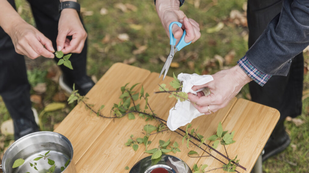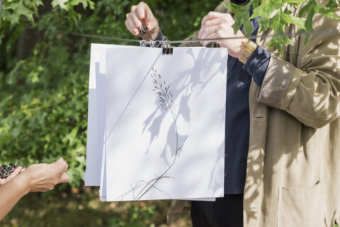 Terug naar mijn bezoek aan het Zaartpark: iets verderop tref ik Maud aan terwijl ze fotoprints van planten aan een waslijn hangt. Aan de oever van een beek zijn wat stoelen klaargezet en een draagbaar gaskookstel. Ik ben uitgenodigd om samen met een groepje geïnteresseerden op expeditie te gaan naar het 49m²-gebied en dit is onze uitvalsbasis. Wanneer alle voorbereidingen getroffen zijn en de laatste deelnemers gearriveerd, vraagt Maud ons mee naar het veldje om brandnetels te plukken en terug bij de oever wordt het gaskookstel aangezwengeld om er thee van te zetten. We kunnen met de voorbereidingen voor onze expeditie beginnen.