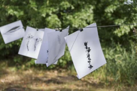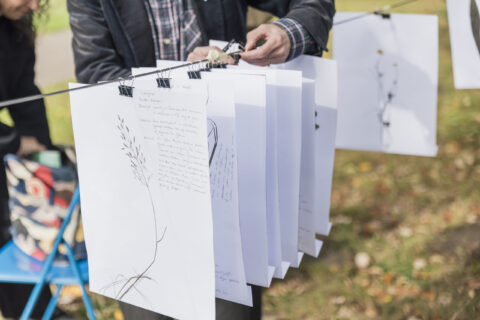 “Voordat ik iets ging doen, wilde ik kijken naar wat er al is – wat het dan is waar je een interventie in doet.” Als eerste stap in haar onderzoek nodigde Maud Jacques Rovers van de Bredase afdeling van de Koninklijke Nederlandse Natuurhistorische Vereniging uit. Met hem inventariseerde ze alle plantensoorten die op het kleine gebied te vinden zijn. Al deze soorten verzamelde ze in een herbarium, waarvan de afbeeldingen achter ons aan de lijn hangen. Wat frappeert is de veelheid. Wat op het oog een grasveld met wat brandnetels en één of twee mij onbekende planten lijkt, blijkt zo’n éénentwintig verschillende soorten te bevatten: “Al die planten die hier zijn vertellen ons iets over deze plek. Bijvoorbeeld dat de grond erg nat is, en nog echt bij de rivierbedding hoort.” Het riviertje Aa of Weerijs ligt zo’n vijftig meter verderop, net uit het zicht. Dan grinnikt Maud: “Ik dacht na jaren ‘n keer niet met een rivier te werken, maar het achtervolgt me.” Door de verschillende soorten te determineren en een naam te geven kan je, bijvoorbeeld via het internet, makkelijk informatie vinden en veel over de planten, maar dus ook over de plek waar ze groeien, te weten komen.