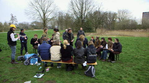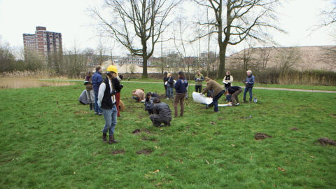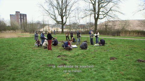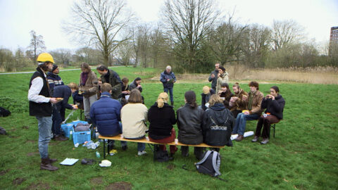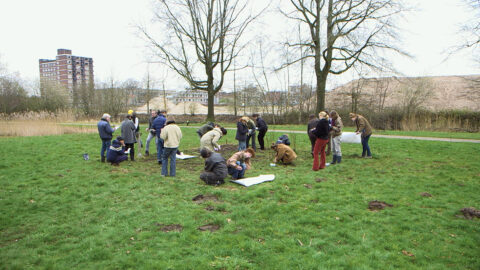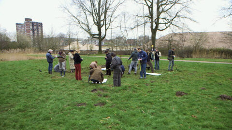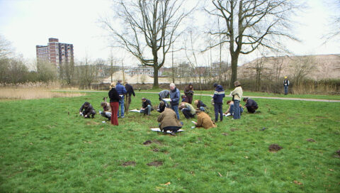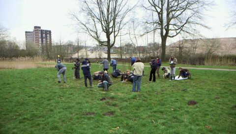 Als iedereen is aangekomen in het park krijgen we van Emmens een spoedcursus onderzoek doen die ons in staat zal stellen de 49 vierkante meter park volledig in kaart te brengen. Dit afgebakende stuk Zaartpark van zeven bij zeven meter is een project van kunstenaar Gerrit-Jan Smit die in 2016 met de Gemeente Breda afsprak dat ze de komende twintig jaar geen onderhoud meer doen op dit stukje grond. Emmens verdeelt de groep onder in meetkundigen; die alles binnen de 49m2 zullen opmeten en noteren, en specialisten te weten: cartografen, aardrijkskundigen en geschiedschrijvers. De cartografen krijgen de opdracht om de 49m2 visueel in kaart te brengen met potlood op een groot vel papier. De aardrijkskundigen gaan zich bezighouden met het nemen van bodemmonsters en het beschrijven daarvan. Samen met twee anderen wordt mij de taak van geschiedschrijver toebedeeld: wij gaan het hele onderzoek vastleggen en beschrijven. Allemaal zullen we een uur lang bezig zijn op de zeven bij zeven meter.