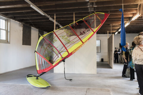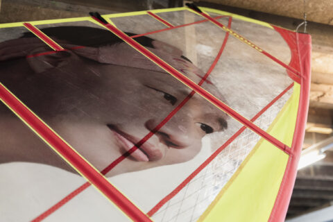 Ahn Sung Hwan’s werk bevindt zich daarentegen wel op de grens van ‘overlast’ voor de omgeving. Hij plaatste tijdens zijn residency namelijk een enorm billboard met zijn eigen gezicht en telefoonnummer in de 49 vierkante meter. In de tentoonstelling staat een surfplank die ook nauwelijks in de ruimte past en is geklemd tussen de vloer en het plafond. Op het zeil is een tekst te lezen: Nice Ahn! Nice Artist! (+31) 06 17 26 85 55. Het werk heet veelbetekenend In Search of the Miraculous (2025). Ik word meteen nieuwsgierig en bel het nummer. Helaas is het nummer buiten gebruik, maar op de website van de kunstenaar vind ik T-shirts met dezelfde tekst en foto te koop, die My Walking Billbord heten. Wie het shirt aantrekt wordt direct deel van de live performance voor de Nice Artist, lees ik. Even fascinerend vind ik de enkele vijf-sterren review onderaan de pagina van de webshop, geverifieerd en al. Kwanwoo Park schrijft daar over de verassend goede kwaliteit van de T-shirts, en stelt voor om het shirt in de zomer te dragen, maar zegt dat het shirt onder een jas ook in de herfst en winter te gebruiken is. Het toont in twee zinnen de gehele absurditeit van commercie, en ik denk terug aan het billboard van Ploegmakers, dat me ineens performatief aandoet.
