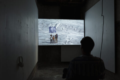 In de tentoonstelling kijk ik naar het indrukwekkende Think Like a Mountain (2020-2025) van Penelope Cain. Zij toont daadwerkelijk het verband tussen twee locaties die ver van elkaar uiteen liggen: de Peruaanse Quelccaya gletsjer in de Andesbergen en de koloniale Spaanse zilvermijn Potosí in Bolivia die op moleculair niveau verbonden zijn. Om dat te bevestigen hijst een drietal lokale bewoners drie vlaggen die samen het beeld van een galenietkristal vormen. Een werk dat een analogie is met haar residency, eerder op de 49 vierkante meter genaamd Kingdom of the Moles, waarbij zij vlaggen plaatste op de vier hoeken van het enige stukje grond in het Zaartpark waar de mollen zich niet lieten zien. Deze speelse actie kantelt ons antropocentrisme. Wellicht is 49 vierkante meter te interpreteren als een langlopend spel voor alle levende wezens.