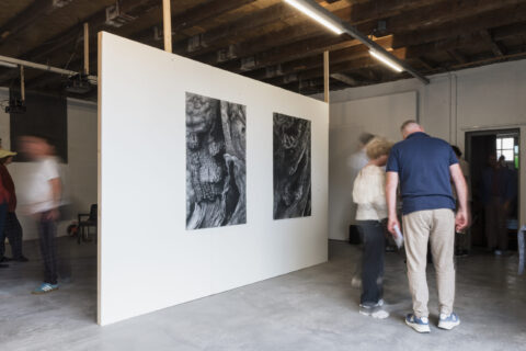 Dezelfde ontroering voor precisie voel ik bij de gigantische houtskooltekeningen van Sabina Timmermans, getiteld Roots 1 & Roots 2 (2023). Ik heb het gevoel alsof ik in de zwarte gaten kan vallen, en krijg zin om met mijn vingers over de tekeningen te voelen om de structuur te begrijpen. In plaats van afstand nemen van de tekeningen duik ik er zo dicht mogelijk op.