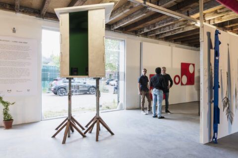 Bij het bezoeken van de tentoonstelling De Vrijstaat – land van 49m² denk ik terug aan dat denkbeeldig ‘gesurveilleerd worden’, ook als er niemand toekijkt. De installatie Bear Witness (2022-2023) van Urša Prek, doet me direct denken aan de hut van Baba Jaga. Het werk is geïnspireerd op Sloveense observatietorens, maar ook een toren voor jagers om de dieren te observeren zonder zelf gezien te worden. De kunstenaar maakte een soundscape van LP’s die ze van haar vader erfde. Als ik me in het huisje over de speakers buig om de soundscape te horen wijst de suppoost me op de schoonheid van het object vanaf een afstand. Hij heeft gelijk. Angstaanjagend groot wordt de hut, en ineens zie ik haar functie. Ook deze tentoonstellingsruimte lijkt namelijk geobserveerd te worden vanuit de gigantische hut. Ik zou er graag in klimmen, maar bedenk me dat ik zelden afstand neem om de dingen in hun geheel te bekijken. Ik ben dan ook geen schilder, die afstand neemt van het doek om tussen het schilderen door het geheel te bekijken. Afstand nemen heeft iets kwetsbaars, je neemt immers dubbele ruimte in: zowel de ruimte van het eigen lichaam, als de afstand tot wat je observeert. Tenzij het geobserveerde zelf een open ruimte is. Zoals een stuk grond in een park, bijvoorbeeld. Of de lucht.