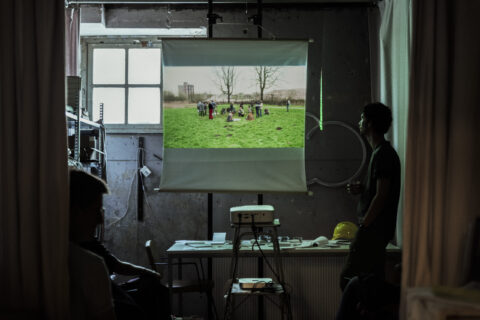 Sinds 2020 observeert ieder seizoen een andere kunstenaar het stuk grond, wat de kracht van het project is. Niet het bouwen van grote dingen, niet het toe-eigenen, maar door te kijken wat er gebeurt, is meestal het startpunt van een proces dat nog lang kan doorwerken. Dat resulteert vaak in verschillende soorten metingen of verzamelingen van data, wat misschien ook een vorm van toe-eigening of ‘eigen maken’ is. En het levert bruikbaar materiaal op. Bo Emmens bijvoorbeeld, die in zijn werk Kadestraal Fenomenologisch Landmeetonderzoek 49 Vierkante Meter (2024) een zelf opgerichte Landmeetkundige Vereniging de grond in kaart liet brengen. Iemand mat nauwkeurig een van de palen, en noteerde dat de grasspriet aan de westzijde van het veld bijvoorbeeld 0,3 cm breed was. De absurde nauwkeurigheid ontroert me, en doet me eveneens beseffen hoe weinig ik begrijp van schaal en afstand. Metingen zijn weliswaar essentieel in de bouw, daarbuiten lijken ze een abstracte, losstaande wereld. Ik ben dan ook geen architect die zich geen onnauwkeurigheid kan permitteren omdat de kleinste misberekening in een bouwplan het instorten van een gebouw kan betekenen.