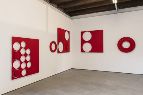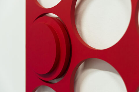 Britte Koolen vertaalt de stilte juist naar aanwezige, rode sculpturen gebaseerd op ordening van tussenruimte. In de geometrische werken herken ik niets meer van het onbeheerde stuk natuur, maar herken de drang naar het ordenen, meten, in kaart brengen en daarmee transformeren van de grond. Ik kan me voorstellen dat ze zoekt naar overzicht.