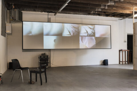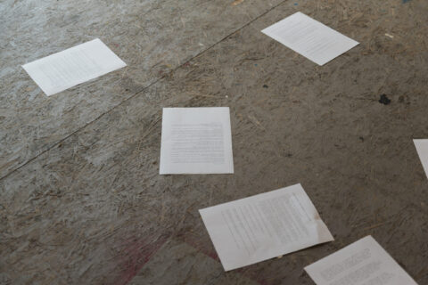 De constante van 49 vierkante meter is slechts het contract zelf, een afgesproken tijdsspanne van twintig jaar en de toegewezen locatie. Verder is alles onderhevig aan verandering. De geluiden binnen de afgesproken begrenzing veranderen elk moment, de wind waait af en aan, dieren vliegen over. Letizia Artioli maakt dat hoorbaar in Public Space is What Happens Between Soil and Clouds (2025), waarin ze geluiden vangt uit verschillende lagen van de 49 vierkante meter, zoals de grond, de vogels, het water. Haar geschreven reflecties benoemen telkens het afwezige tussen de geluiden door, de stilte. Ik vraag me af hoe je een achtste meter kan toevoegen, boven het stuk grond, hoe klinkt dat? Ik krijg de neiging om de afstand tussen de hangende speakers van het werk te meten, voel de ruimte in hoe ze bewegen en zie de 49 vierkante meter ineens in de verhoudingen van een vel papier. Ik bereken: