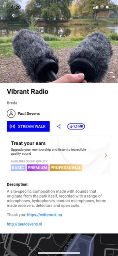 Met behulp van al deze opnames heeft Paul een soundscape gemaakt met als titel Vibrant Radio, die voor het publiek beluisterbaar wordt via de app Echoes. Echoes is een sound mapping app waarmee je onder andere locatie-specifieke soundscapes kan maken. Belangrijk hierbij is dat de soundscape niet losgekoppeld wordt van de plek waar het geluid is opgenomen. Zo blijft het landschap zelf onderdeel van de beleving. Je koptelefoon wordt zo niet slechts een middel om een zintuig af te sluiten, maar eerder het tegenovergestelde: ze bieden de mogelijkheid om je gehoorzintuig te versterken en op vernieuwende wijze te benutten, dankzij technologie. Dit stelt de bewoners en bezoekers van het Wilhelminapark in staat om het park op een nieuwe manier te ervaren. Paul hoopt dat zijn soundscape de verbeelding prikkelt en dat er mogelijk persoonlijke verhalen en ervaringen ontstaan die zijn geprogrammeerde soundscape overtreffen. Want hoewel je je begeeft in een cocon van de geluidscompositie, ervaart iedere luisteraar het geluidswerk niet alleen, maar midden in een park met ook het geluid van de andere levensvormen om zich heen. Paul wijst ook op het feit dat tijdens een opnamesessie een regenbui hem verraste, en dat deze regen nu ook terug te horen is in de soundscape. Hiermee zal het geluid van de regen wellicht een andere ervaring bieden voor iemand die tijdens de zomer in de stralende zon door het park wandelt.