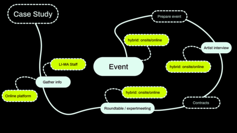 Florian legde uit dat ze op het moment aan het werken zijn aan de ontwikkeling van het concept van het online platform, en dat concept zal geeft inzicht hoe het LI-MA kantoor kan veranderen. Er gebeuren zo veel dingen bij LI-MA; onsite heeft LI-MA een kantoor, archief, bibliotheek, etc. en binnenkort nog meer mogelijkheden die kunnen worden geïmplementeerd in de ruimte. Bijvoorbeeld, als er een interview met een kunstenaar wordt afgenomen als onderdeel van een case study, dan kan dit ook via livestream. Of als er een workshop in dezelfde ruimte is, dan kun je de tafels omdraaien en heb je meer ruimte voor iedereen.