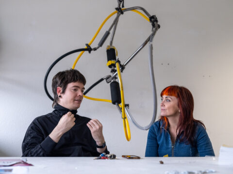 Een van de eerste overeenkomsten met Benjamin die ik ontdekte is onze manier van denken over ruimte en de plaatsing van het werk daarin; alsof elk onderdeel een levend personage is. In mijn praktijk onderzoek ik de eenvoud van het tekenen op papier en dat resulteert in monumentale, ruimtelijke tekeningen en sculpturen. Benjamin daarentegen transformeert kant-en-klare materialen tot objecten die op subtiele wijze de toeschouwer desoriënteren, waardoor een gevoel van vervreemding ontstaat en een nieuwe manier om naar de werkelijkheid te kijken. Hij beschrijft deze vervreemding als ‘de afstand wordt een brug’ die uitnodigt tot een nieuwe vorm van verbinding. Ik ben dan ook onder de indruk van de manier waarop hij woorden in zijn werk integreert, hoe hij taal verweeft met vorm, en ik ben nieuwsgierig naar zijn nieuwe plannen met geluid, performance en bewegend beeld. Zijn werk is rijk aan taal en vol mogelijkheden die ik graag verder zie ontvouwen.