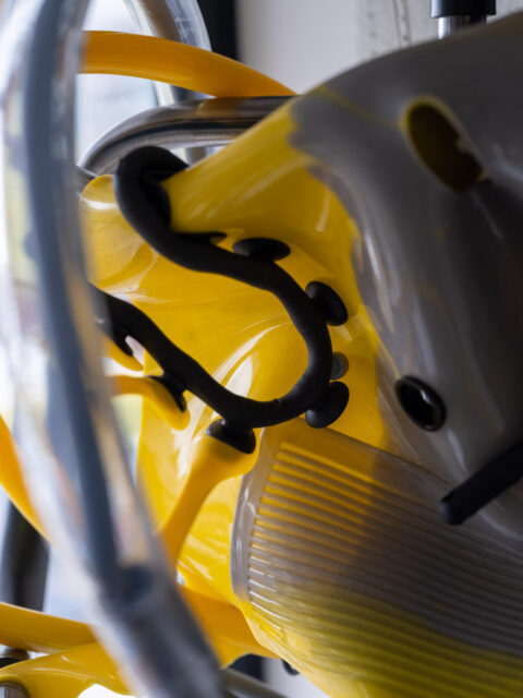 Het is een materiele praktijk, waarmee ik kan reflecteren op koude objecten die refereren naar industriële productie. Meestal bevinden die op een verre afstand van de mens, en als ze dan dicht bij het lichaam komen ontstaat er spanning. Het materialisme refereert naar de infrastructuur van het consumentisme dat uiteindelijk wordt gestimuleerd door verschillende lagen in het imperialisme: een constante economie die maar moet blijven groeien. Er zit een crash in het systeem van het constante vernieuwen en het oneindig produceren, dat kan eigenlijk niet, en dat koppel ik aan een lichamelijk thema zoals burn-out. Toen ik dat onderzocht werd ik ervan bewust hoe groot die impact is, dat kun je nauwelijks bevatten waardoor er desoriëntatie ontstaat. Die desoriëntatie is mijn drijfveer om mijn werk ongrijpbaar te maken. Het glimt, het is actief, soms onder spanning en tegelijkertijd is het passief of vermoeid. Bijvoorbeeld iets wat in een constructie hangt zoals een vel siliconen dat een vervreemde en soms zelfs onaangenaam gevoel afgeeft, terwijl dat niet altijd ergens naar is te herleiden.