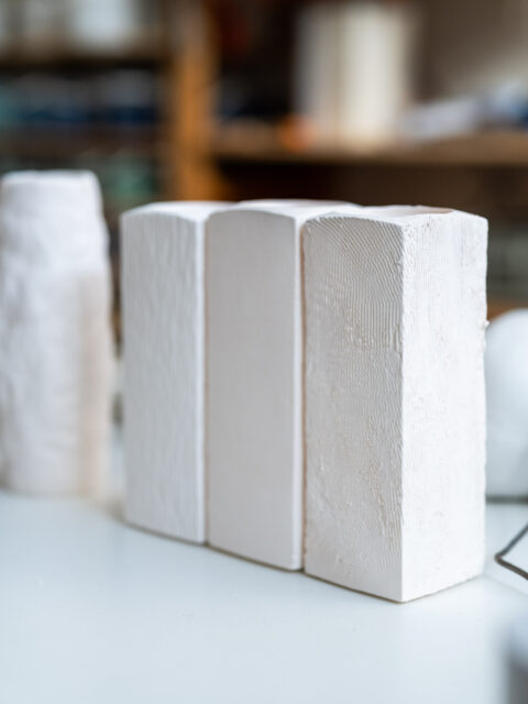 Ik ben nu met kleine werkjes bezig – schetsjes – en met potten. Dat heb ik al heel lang uitgesteld en maak daar nu in het atelier veel mallen voor, ik heb er echt zin in om dat te doen. Ik ben dus wel bezig met keramiek, maar nog niet met een nieuwe sculptuur. Bij het volgende grote werk ga ik wel weer met 3D modelling werken, maar de schetsen maak ik van klei. Je ziet zo de verschillende stappen in het proces en dat vind ik ook belangrijk. Bij 3D modelling telt alleen het eindresultaat, terwijl de schetsen in klei ook werkjes zijn.