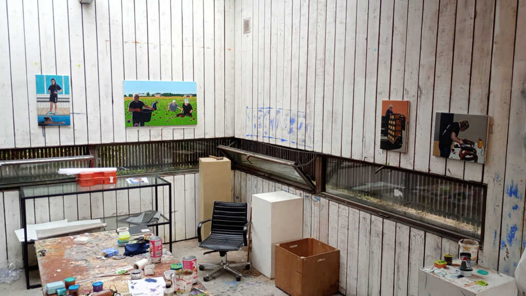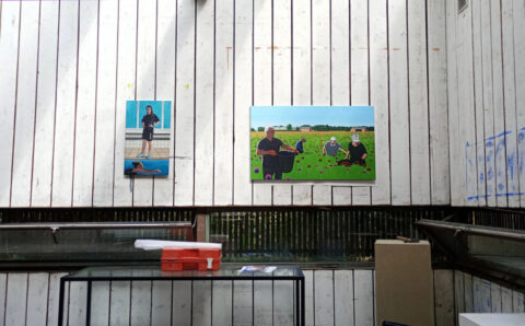Wat ik hier wilde doen is weer teruggrijpen op mijn nog eerdere werk van nog voor mijn Marokkaanse invloeden; ik wilde mensen leren kennen en schilderen, zoals in mijn serie van werkende mensen. En als je in augustus komt, zoals ik, dan is er dus het bloemencorso waar iedereen in Zundert mee bezig is, maar ik wilde ook andere werkende mensen schilderen. Zoals een badmeester, dat wilde ik altijd al een keer doen, maar hoe benader je zo iemand zonder dat het raar is. Ik had het als idee geopperd via de familie en die hebben gelijk al iemand voor me gevraagd. Dat is Celinah, en die wilde wel poseren, dus dat was een fijne binnenkomer. Ze had ook eerder model gestaan, dus poseren was haar niet vreemd. Ik heb een aantal foto’s van haar gemaakt en die verder uitgewerkt in een schilderij. Normaal werk ik een paar weken aan een schilderij, maar hier zat er druk achter. En dat lukte dus ook.