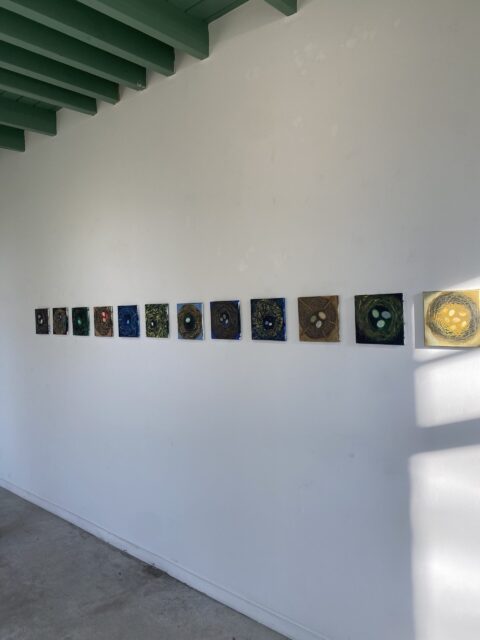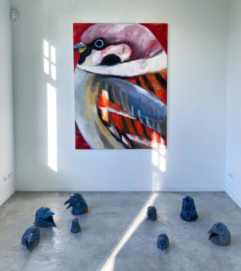 D: Ik kwam hier dus op een heel andere manier binnen dan anders, en ging me ook verdiepen in Vincent van Gogh. Vooraf heb ik een documentaire over Vincent bekeken die ging over een soort bedevaartstocht naar Arles waar hij toen allerlei houtskooltekeningen maakte. Ik had het plan om ook zoiets te doen en ben gaan wandelen in landgoed De Moeren, waar ik tot aan mijn knieën in de modder zakte. Lekker romantisch! Ik ben er wel gaan tekenen, maar het was gewoon niet zo interessant. Ik kan niet zo goed tekenen als Vincent. Toen ontdekte ik dat hij een fascinatie had voor vogels. Nu ben ik daar zelf ook mee bezig door vogelnesten te beschermen omdat ik in een bos ben gaan wonen. Ik ben er hier helemaal in op gegaan door studies te maken van vogelnestjes en heb een hele serie geschilderd van alleen maar nestjes met eieren erin. Ik maak er heel veel, en dan selecteer ik daaruit. En de kraaien – die zag ik in het veld, echt een plaag – dus die komen ook terug in de vorm van keramieken kraaienkoppen. En de dooie mus, die Vincent ook heeft geschilderd, die heb ik op het schilderdoek helemaal opgeblazen tot een enorme mus.