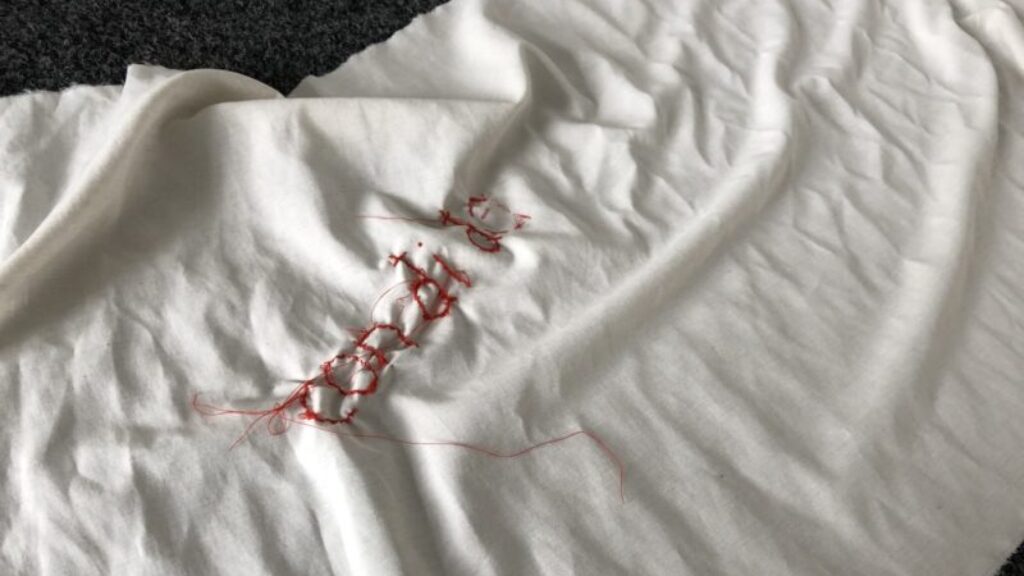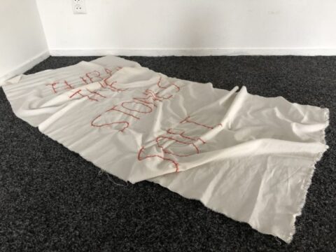 “Met een naald ga ik de huid in en uit. De een op mijn lichaam, de ander los van mijn lichaam. Ik tatoeëer stukjes van mijn gedichten op mijn lichaam met de handpoke techniek, een traditionele techniek waarbij je handmatig met de naald een tattoo zet. Dit vertaal ik vervolgens met textiel werken. Met dezelfde beweging, de naald in en uit, verschijnen de teksten in draad op stukken stof. Het is een soort tweede huid waarmee ik een nieuw lichaam creëer los van mijn eigen lichaam. Hiermee poog ik om de grenzen van performativiteit op te zoeken. Het leven is een performance, we doen het allemaal. Zo dragen aspecten als gender, klasse, cultuur etc. een performativiteit met zich mee. Maar zo ook de manier hoe je je gedraagt afhankelijk van de sociale relatie met de ander. Wat betekent het dan nog om mijzelf een performancekunstenaar te noemen? Het tatoeëren van mijn huid is een performance die levenslang door zal gaan. Er is geen duidelijk moment wanneer een performance begint of wanneer een performance eindigt. Daarnaast zijn een groot deel van mijn werken participatory. Ook hier komt de vraag van performativiteit weer terug. Hoezo ben ik de performancekunstenaar als iedereen met mij meedoet? Al spelend met rollen, bevraag ik wie performer/kunstenaar is, wie niet en wie dit bepaald.”