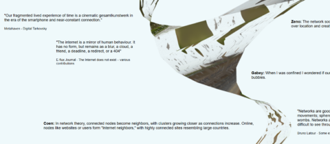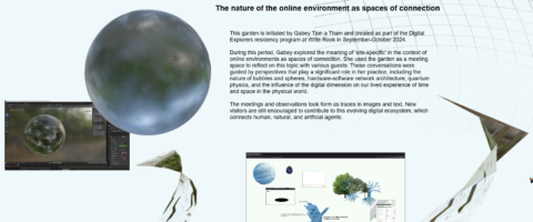 In haar garden komen verschillende vormen van relationeel bestaan samen. Aan de linkerkant is een slideshow te zien met voormalige versies van Gabey’s garden, een “archief in tijd” zoals zij het noemt. Het begint met een zwart gat, gaat over naar lijntekeningen, tot relationele elementen die zijn samengesteld door interacties. Een andere tekstbox nodigt de bezoeker uit erachter te komen welke bomen buiten staan als ze uit hun eigen raam kijken. De genoemde bomen modelleert Gabey in Blender en plaatst ze vervolgens in de garden, waar nu een digitaal bos aan het groeien is. “Ik vind het een mooie manier om verschillende fysieke locaties online samen te brengen. Daarnaast zijn de bomen geïnspireerd door ‘kwantum bomen’, zoals omschreven in Thomas Hertog’s boek On the Origin of Time: Stephen Hawking’s Final Theory. De wortels van de kwantum bomen verbeelden verschillende mogelijkheden van het verleden, en de vertakkingen in de kronen maken uiteenlopende mogelijkheden van de toekomst zichtbaar. “Beide kunnen tot stand komen door interacties en observaties.”, legt Gabey uit. Tussen de herkenbare bomen in haar garden plaatst Gabey 3D-renders. Bomen die hun omgeving weerspiegelen, maar zelf (nog) niet tot een specifiek soort behoren.